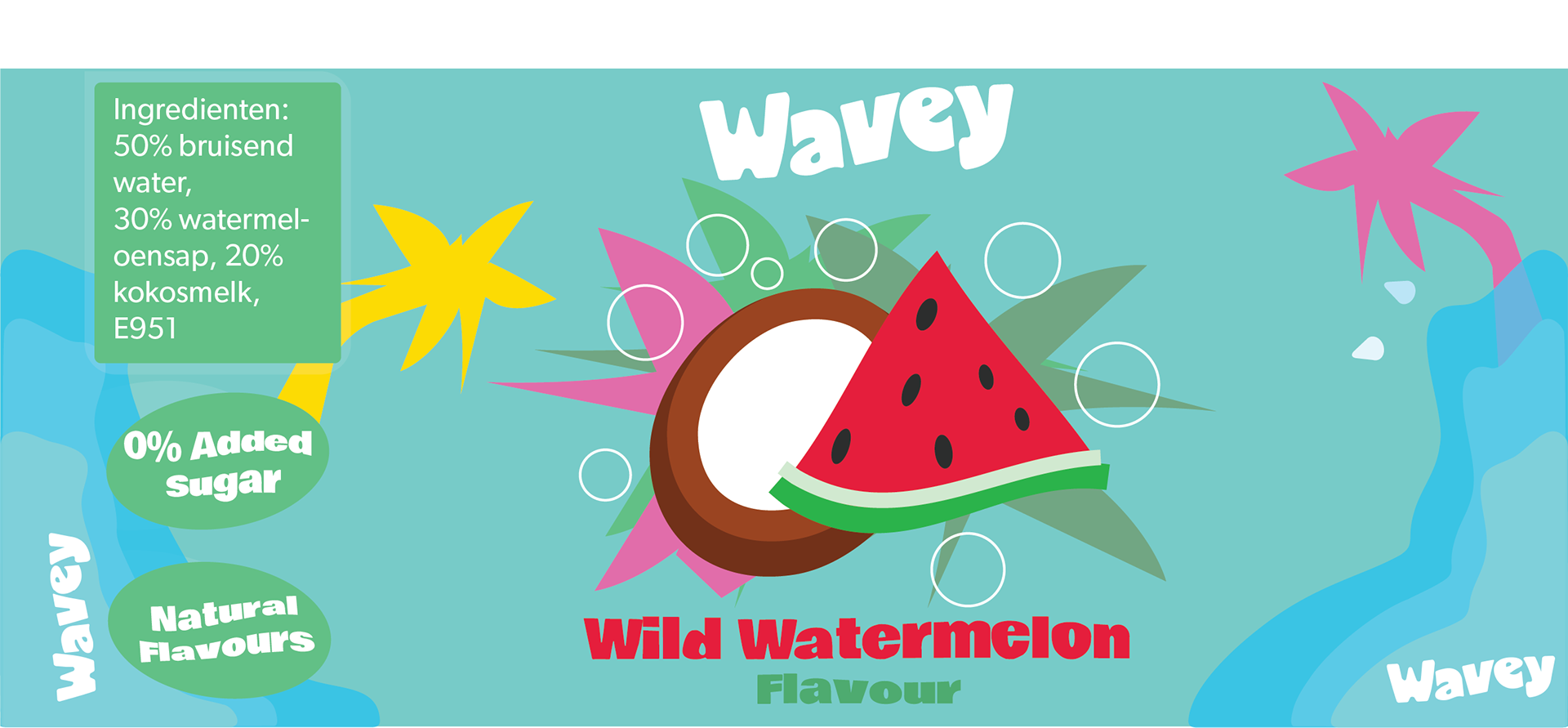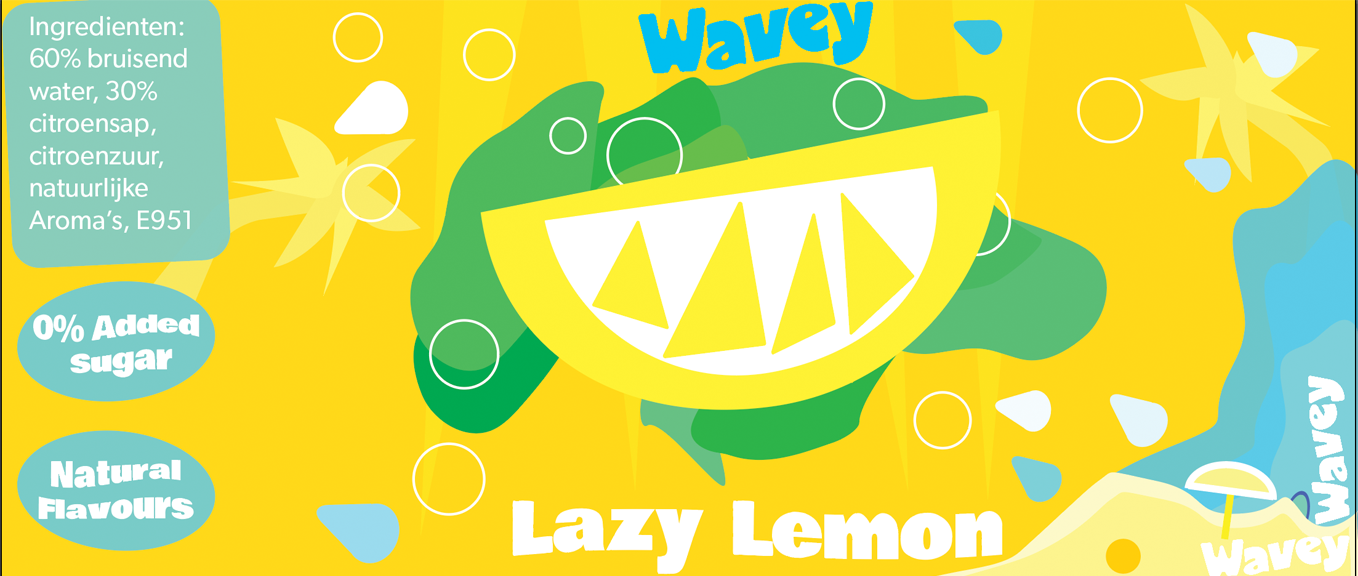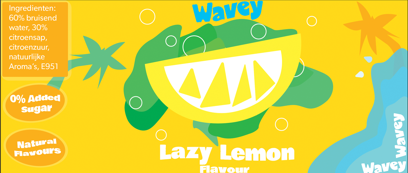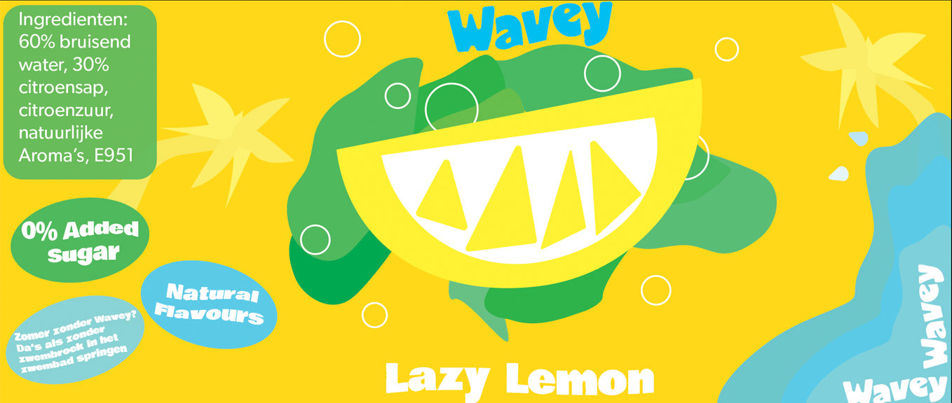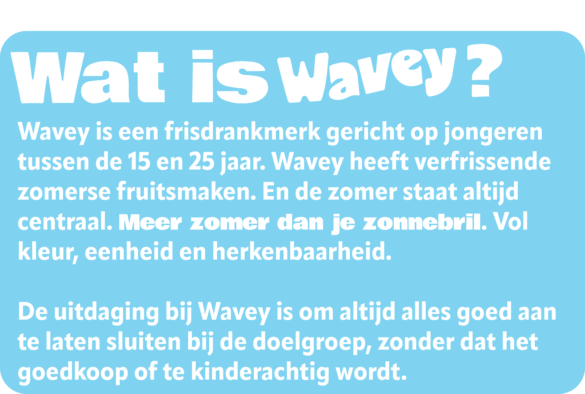 Ken je dat gevoel? Strand, zee zon, lekker warm weer. Dat is het gevoel wat Wavey moet overbrengen. Wavey is een frisdrankmerk gericht op jongeren tussen de 15 en 25 jaar. De stijl is fris, zomers en modern. Vol kleur, eenvoud en herkenning. Zonder dat het goedkoop lijkt. Het ontwerp sluit aan bij de doelgroep en is altijd makkelijk te herkennen als Wavey. Met Wavey heb ik geleerd leren om branding en identiteit te maken en toe te passen, productverpakkingen te maken en marketing en promotie te maken die allemaal dezelfde zomerse, frisse, relaxte stijl hebben. Alles past bij de slogan: ''Meer zomer dan je zonnebril.''